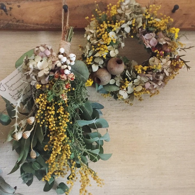 春を呼ぶ✨ ミモザと紫陽花のリースとスワッグ ベルガムナッツ いよいよ待ちに待ったミモザの季節の到来です(๑˃̵ᴗ˂̵) シャビーな色合いに仕上がった紫陽花と ユーカリ等々…沢山の花材をワイヤーのみで少しずつ丁寧に紡いだリースとスワッグです✨ ふんだんに使用したミモザは綺麗にドライアップしました✨ ナチュラルでシャビーな雰囲気をお部屋のアクセントにいかがですか リース 直径 約 16センチ スワッグ直径 約 23センチ 梱包は責任を持って丁寧にさせていただきますが デリケートなドライフラワーの性質上 輸送中の欠け等、発生する可能性がございます旨ご了承くださいます様よろしくお願い致しますm(_ _)m 又、不織布で本体を軽くお包みしますが リサイクルダンボールに入れてのお届けです。 プレゼントの場合、直接相手様へのお届けには不向きかと思われますのでご理解の程よろしくお願い致しますm(_ _)m 何卒ご理解の程よろしくお願い致しますm(_ _)m