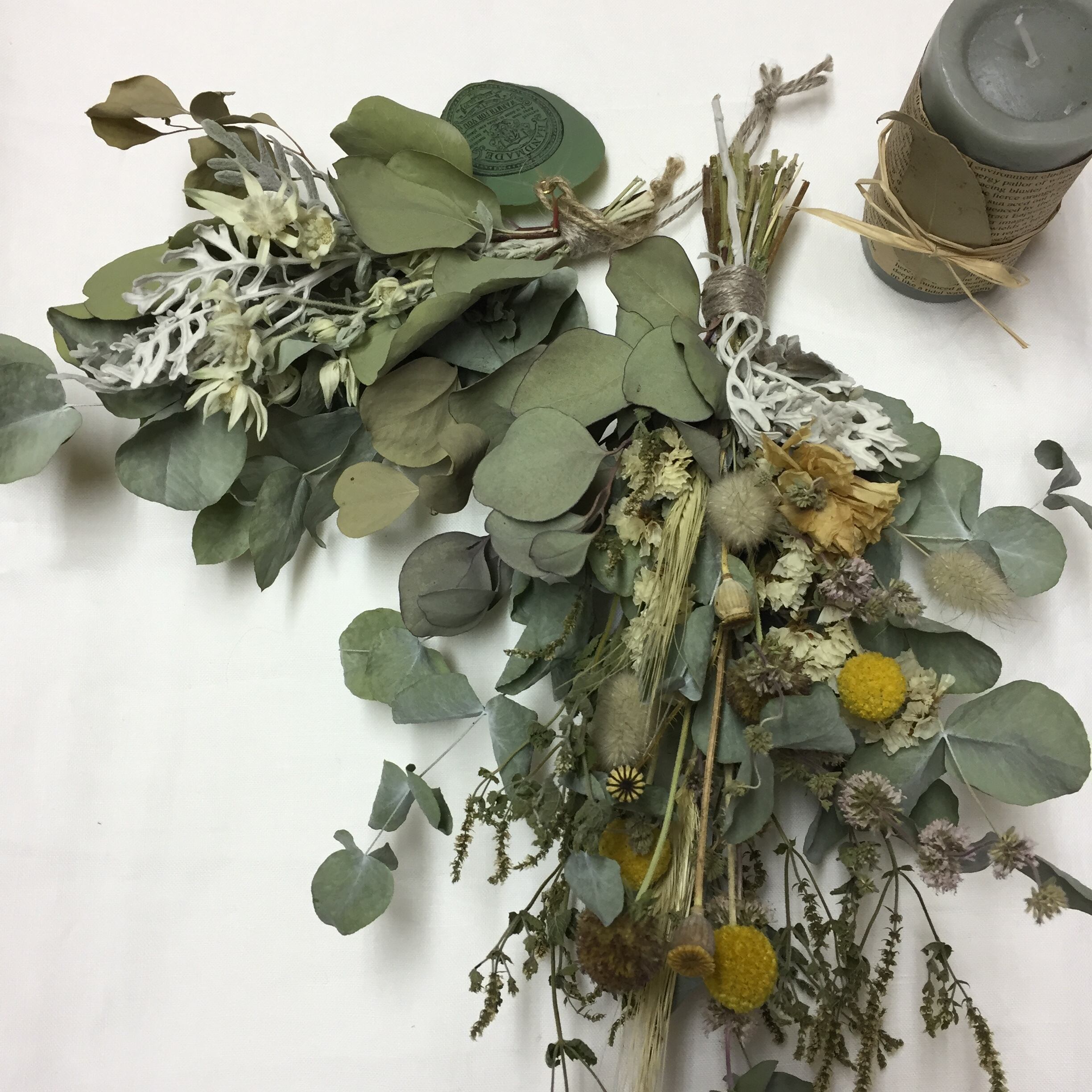 銀丸葉とポポラス2種のユーカリとパイナップルミントの香りが爽やかなドライフラワースワッグです。
