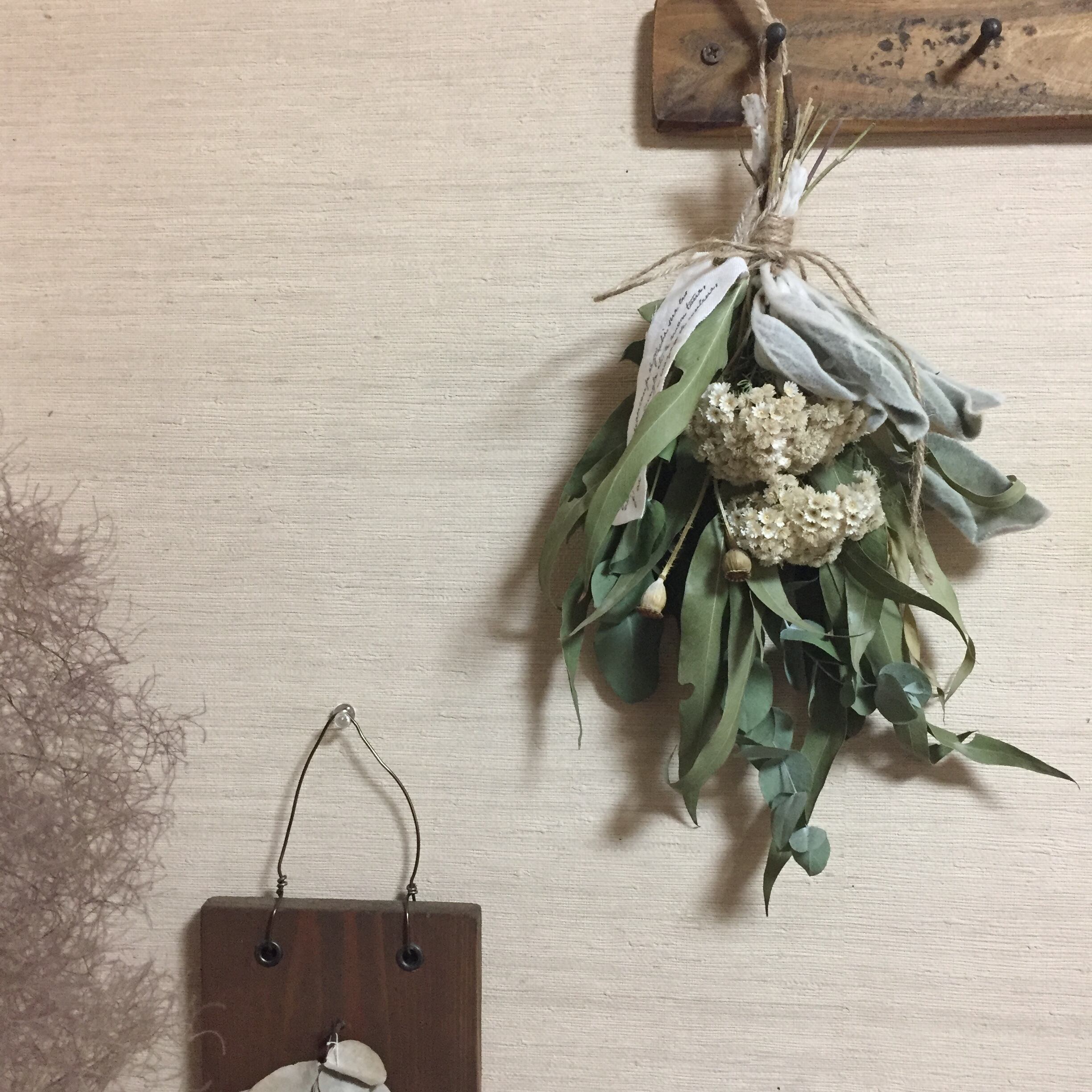 ライスフラワーをメインにラムズイヤー 、ユーカリ、シャーレーポピー で清々しいスワッグを組みました✨