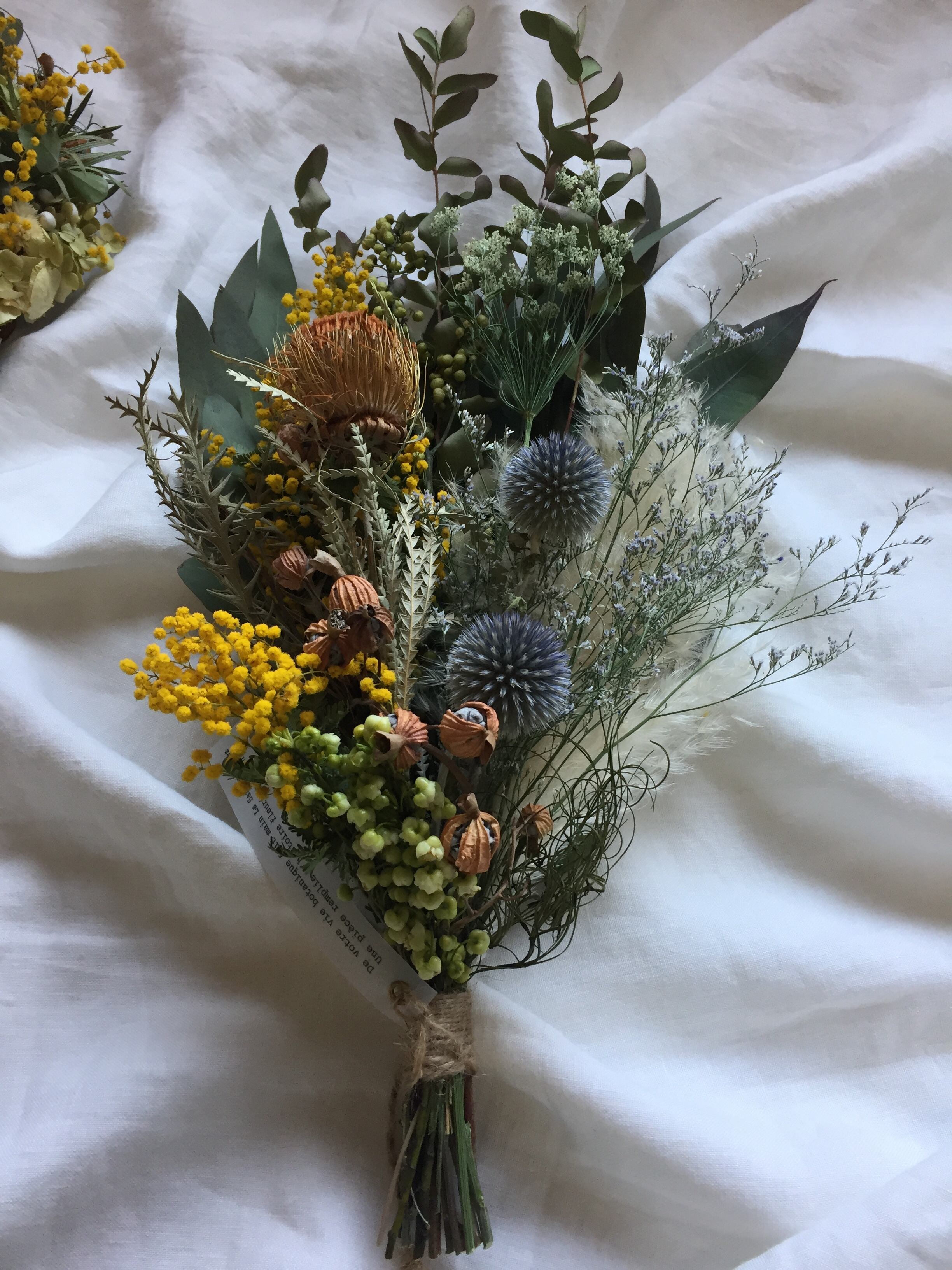 ミモザにドライアンドラ、グレヴィレアなどのネイティブフラワー、パンパスグラス 、月桃の実に優しいブルーのルリタマアザミ とブルーファンタジア等々…