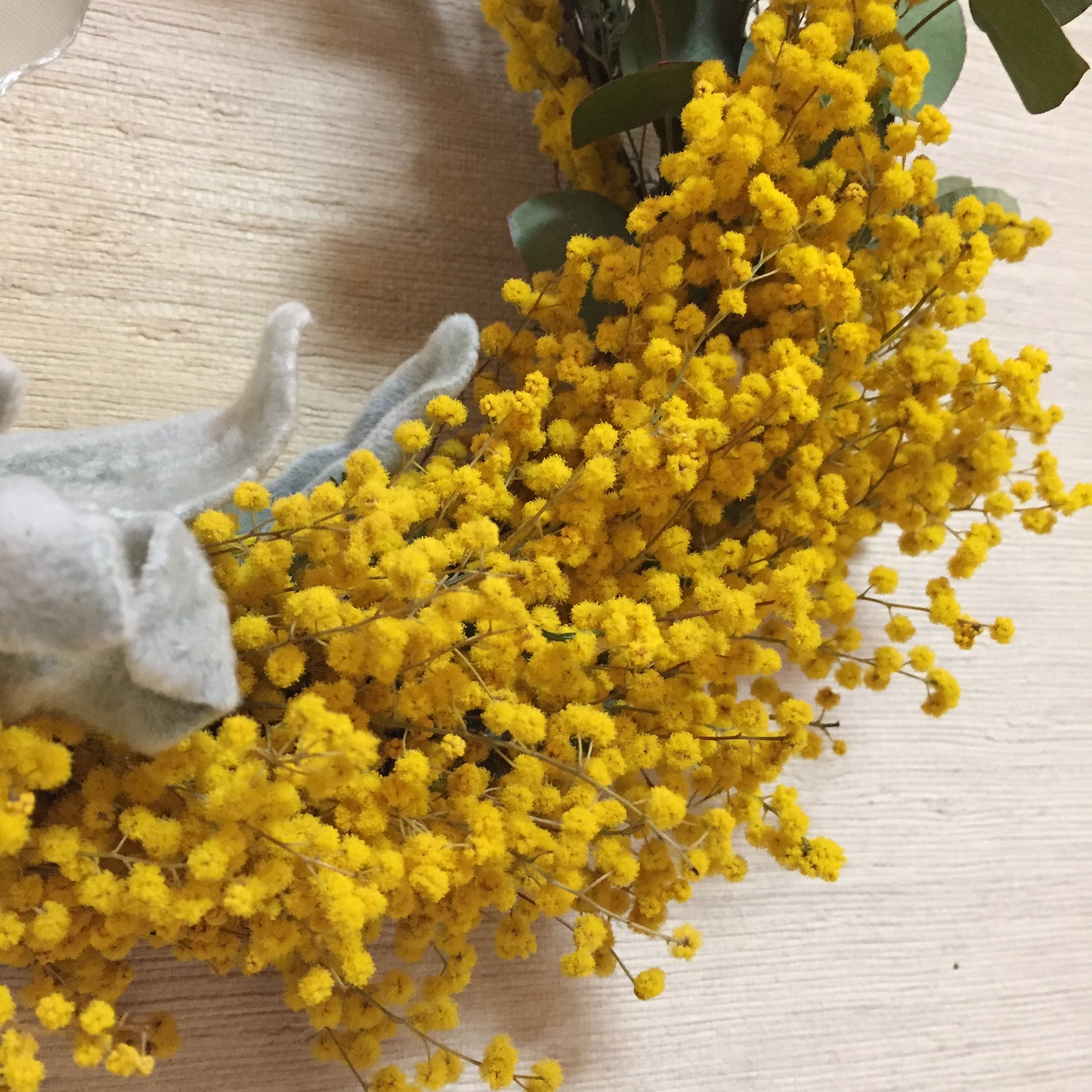 グレヴィレア、ブルーファンタジア 、リボンの横にはフワフワのラムズイヤー をあしらいました。