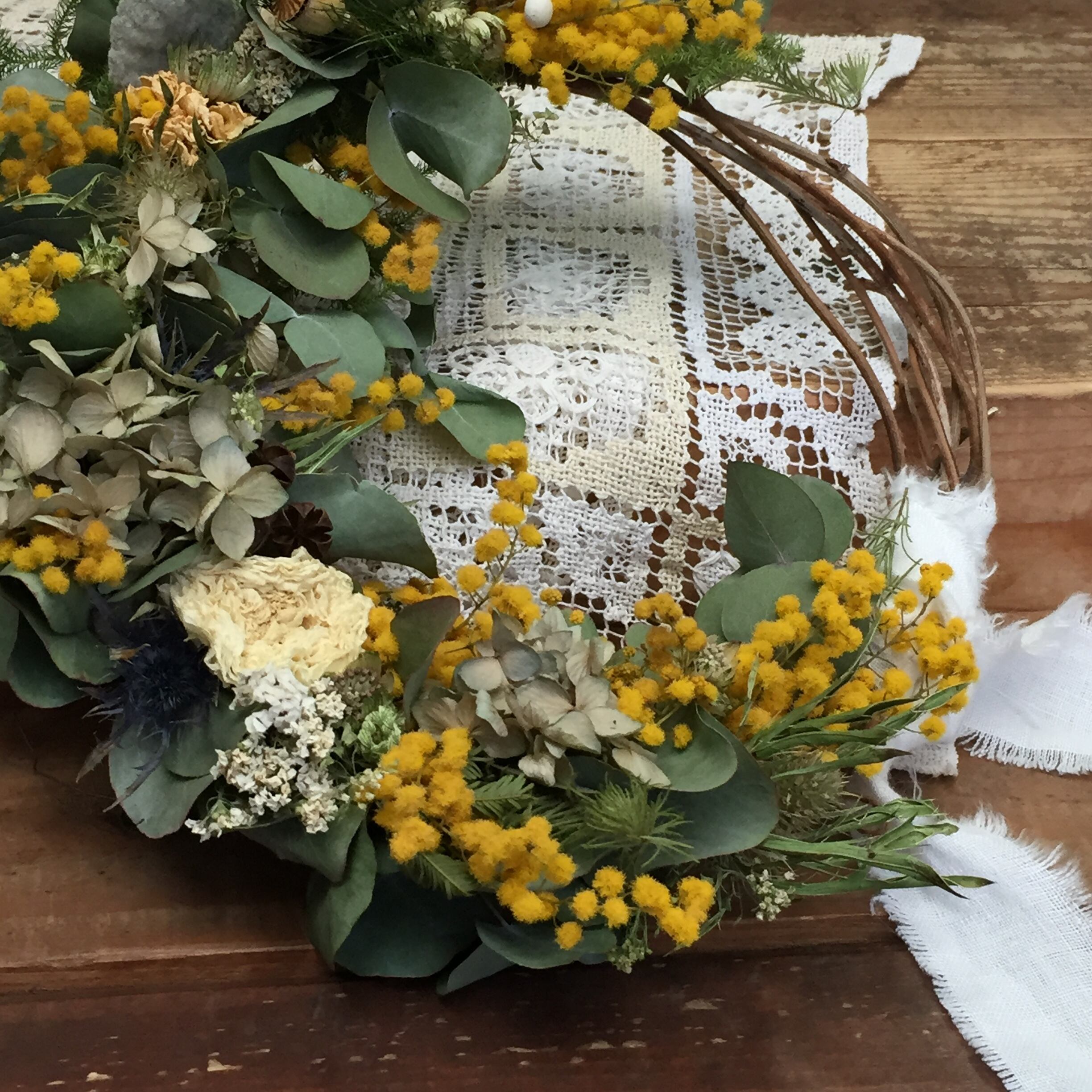 展示のみユーカリとお花いっぱいのリース ミモザ、ラナンキュラス
