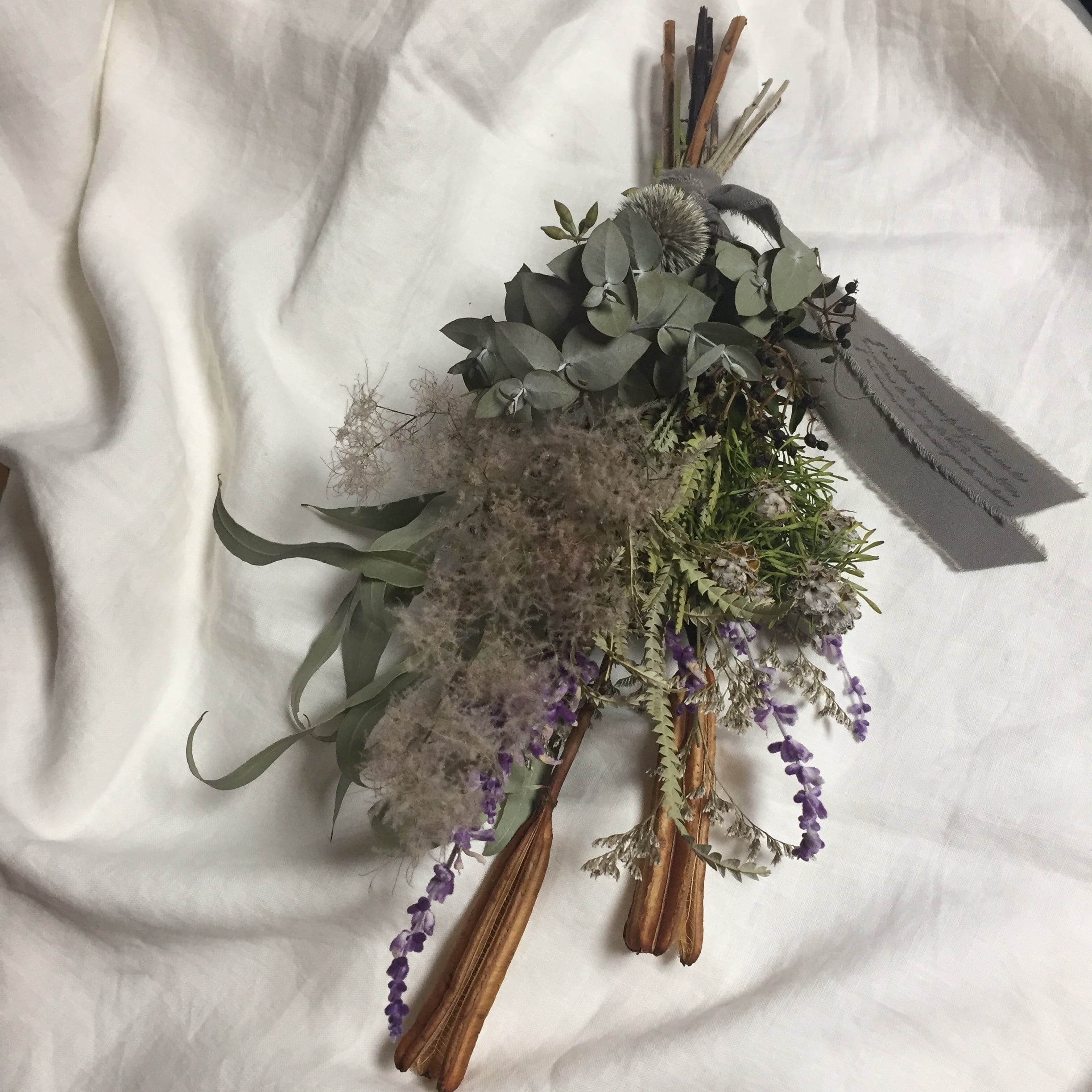 実付きの細葉ユーカリとリュウカデンドロン ジェイドパール、モーヴピンクが可愛い秋咲のスモークツリーなどでお束ねしたスワッグ✨