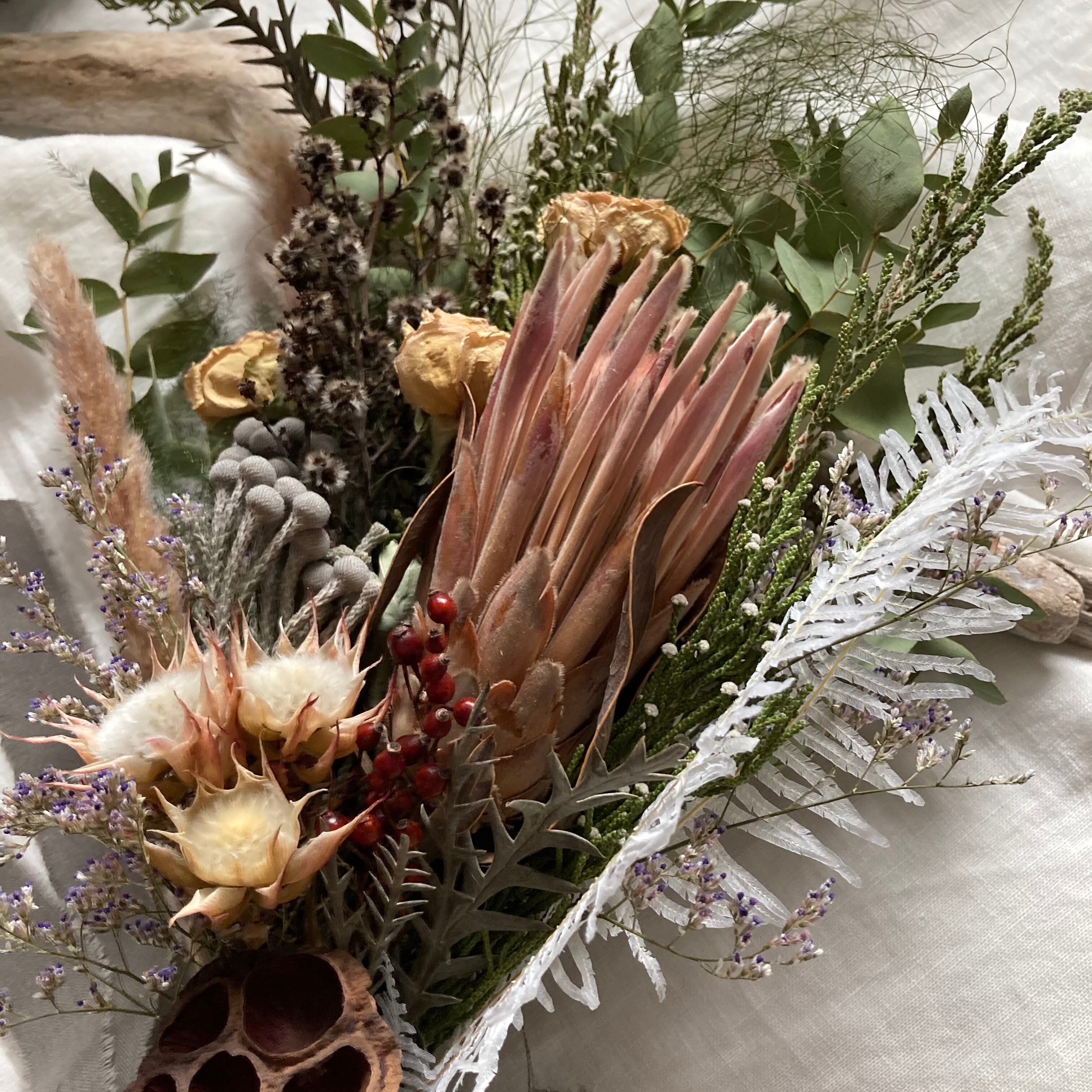 プロテアとセルリアのドライブーケ スワッグ