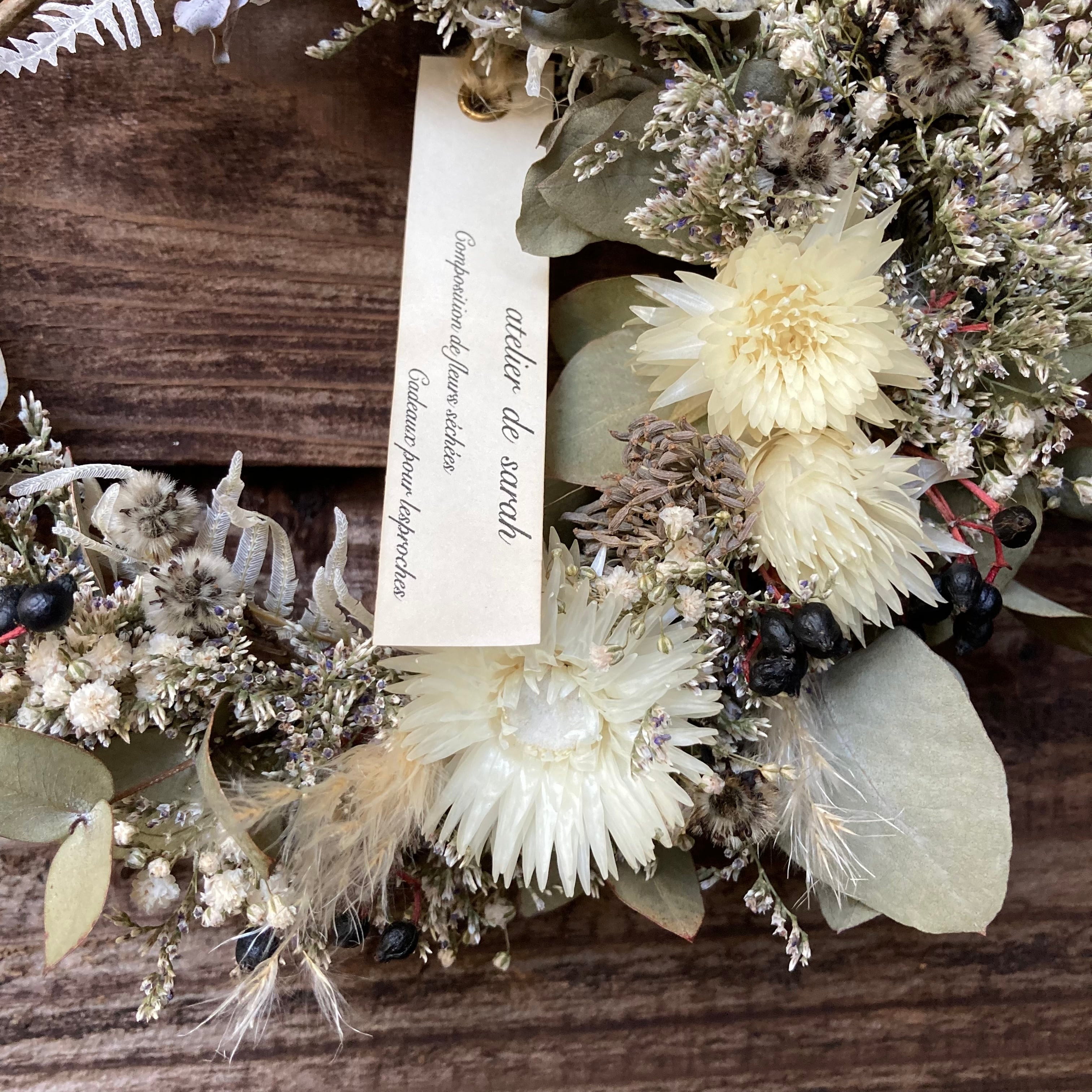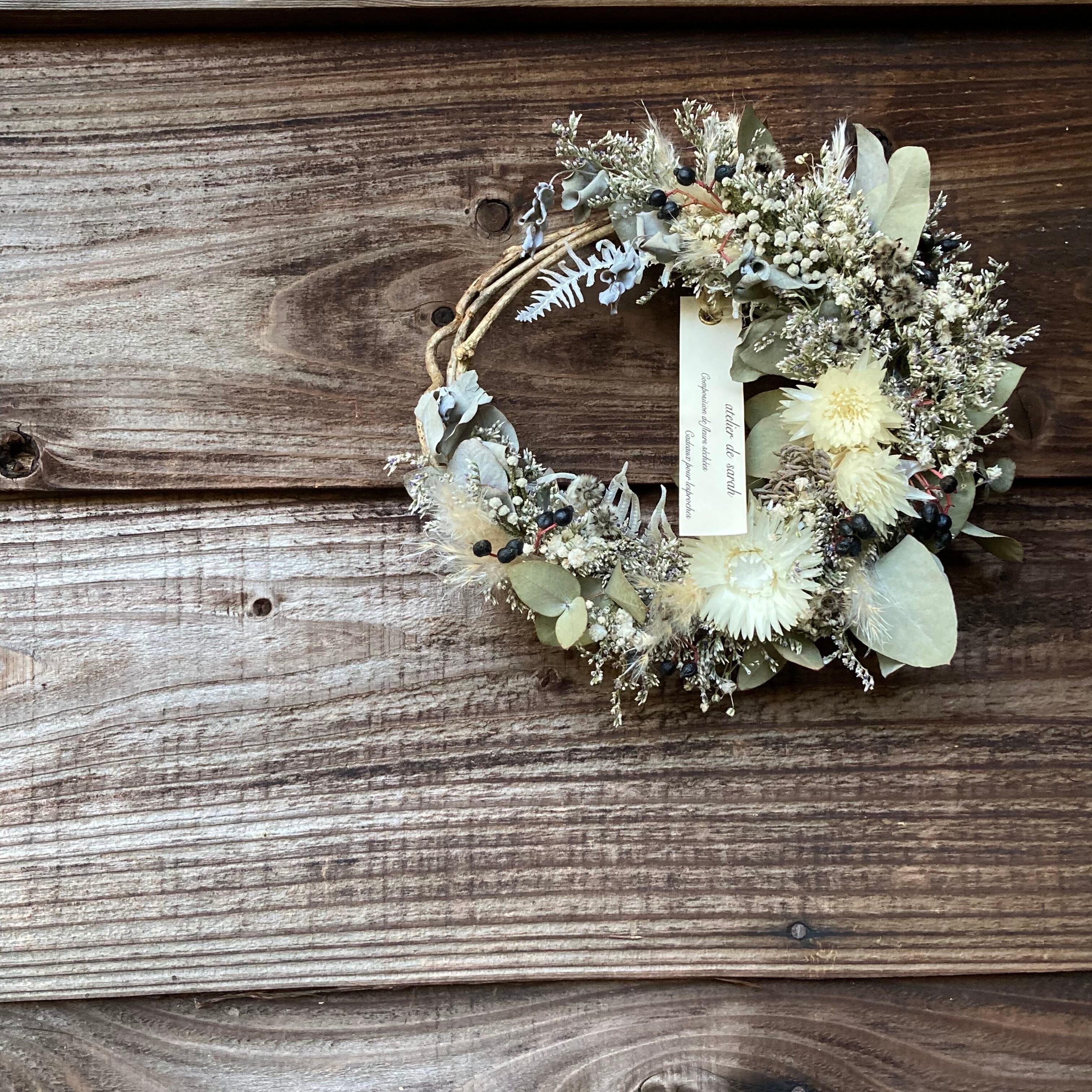 白いシンカルファカップブルーメンを主役にあしらったグレイッシュな大人可愛いハーフムーンリースです✨✨